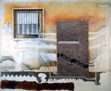 Scheme: view of the façade and of the roof. Inks and color crayons. 148 x 188 cm. 1:20 scale model. Rigid polyurethane foam, aluminum, wood, sand, gouache and shellac. 114 x 102 x 125.